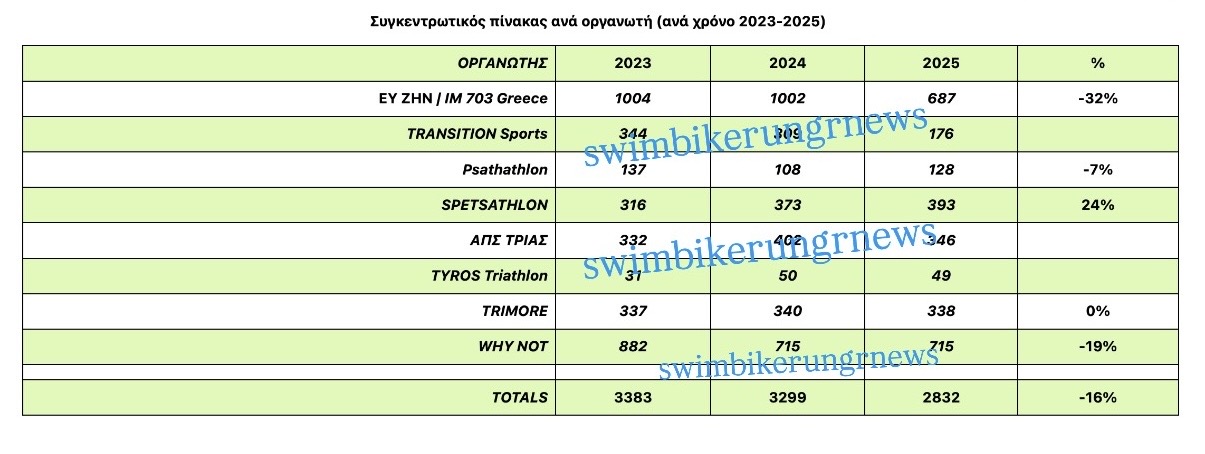 - Με δεδομένο ότι στους Ελληνικούς αγώνες συμμετέχουν περίπου 700-800 non-Greek triathletes (IRONMAN 70.3 Greece, XTERRA Greece, TRIMAN, Spetsathlon κλπ) μένουν περίπου 1800-2000 συμμετοχές Ελλήνων. Αν υπολογίσουμε ότι ένας μέσος τριαθλητής που αγωνίζεται στην μεσσαία απόσταση χρειάζεται 2 με 3 αγώνες προετοιμασίας για ένα τέτοιο εγχείρημα, τότε επιβεβαίνεται προηγούμενη τοποθέτησή μας (την άνοιξη του 2025) που έκανε λόγο περίπου 600 με 650 μοναδικούς τριαθλητές στην χώρα μας.